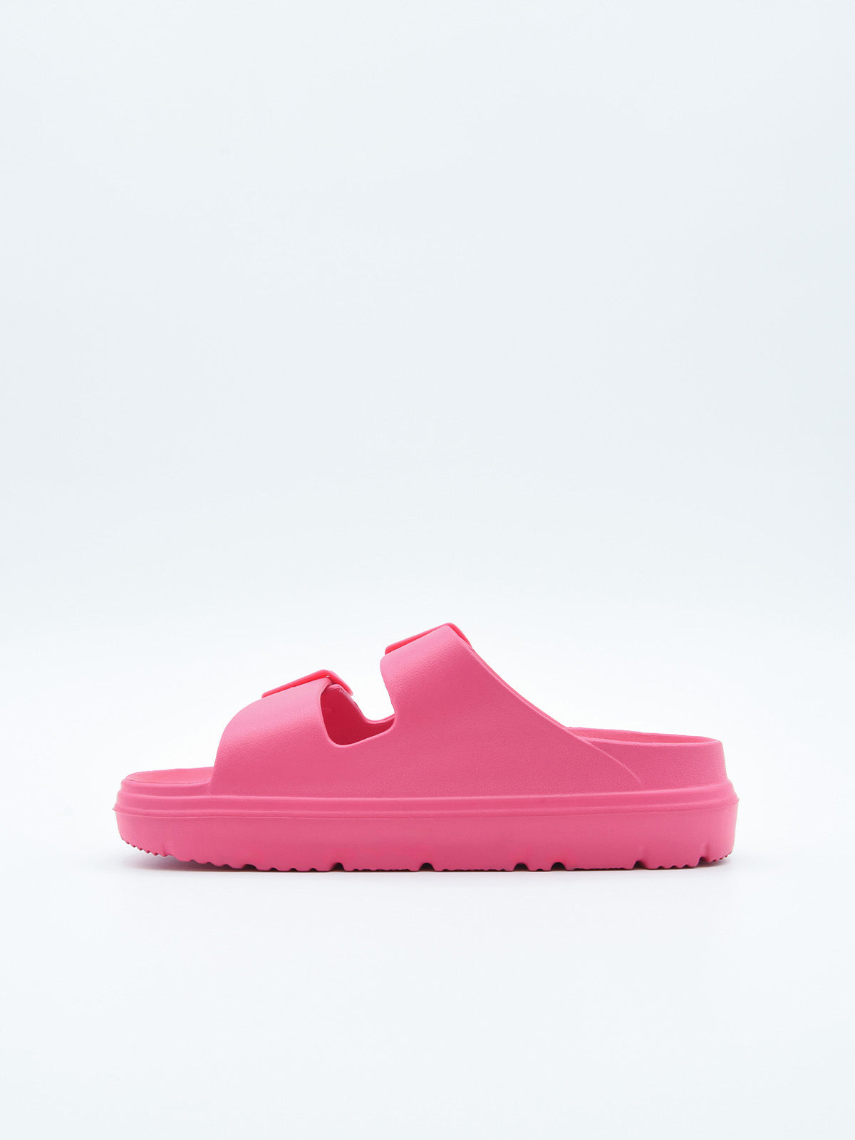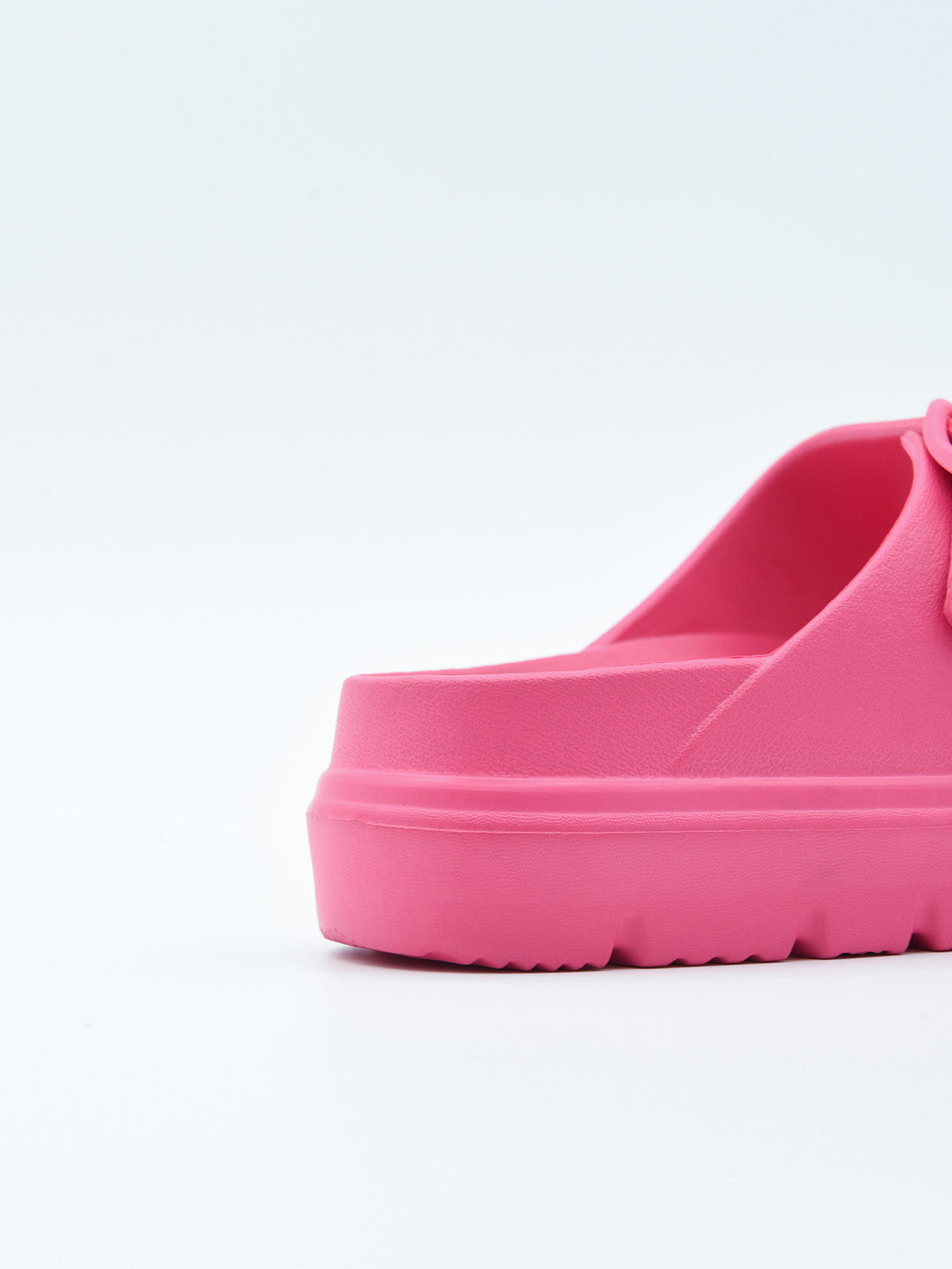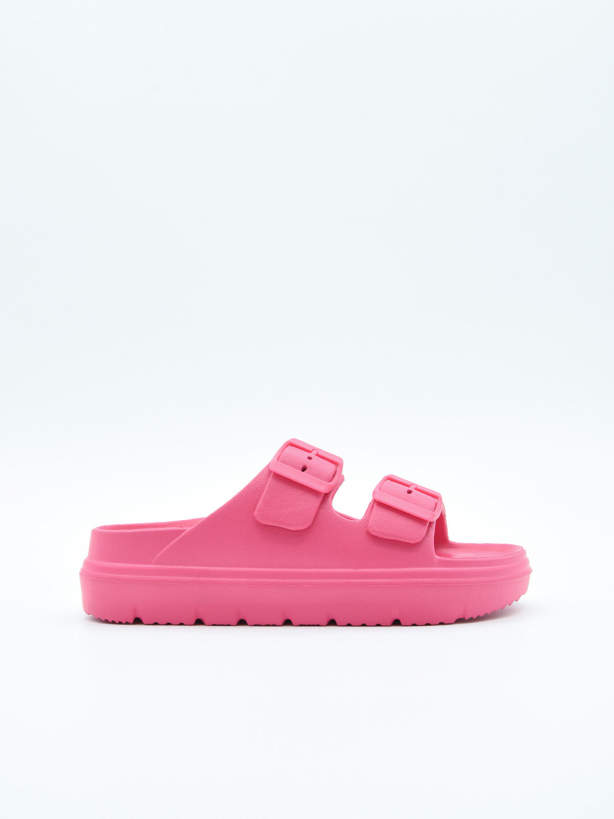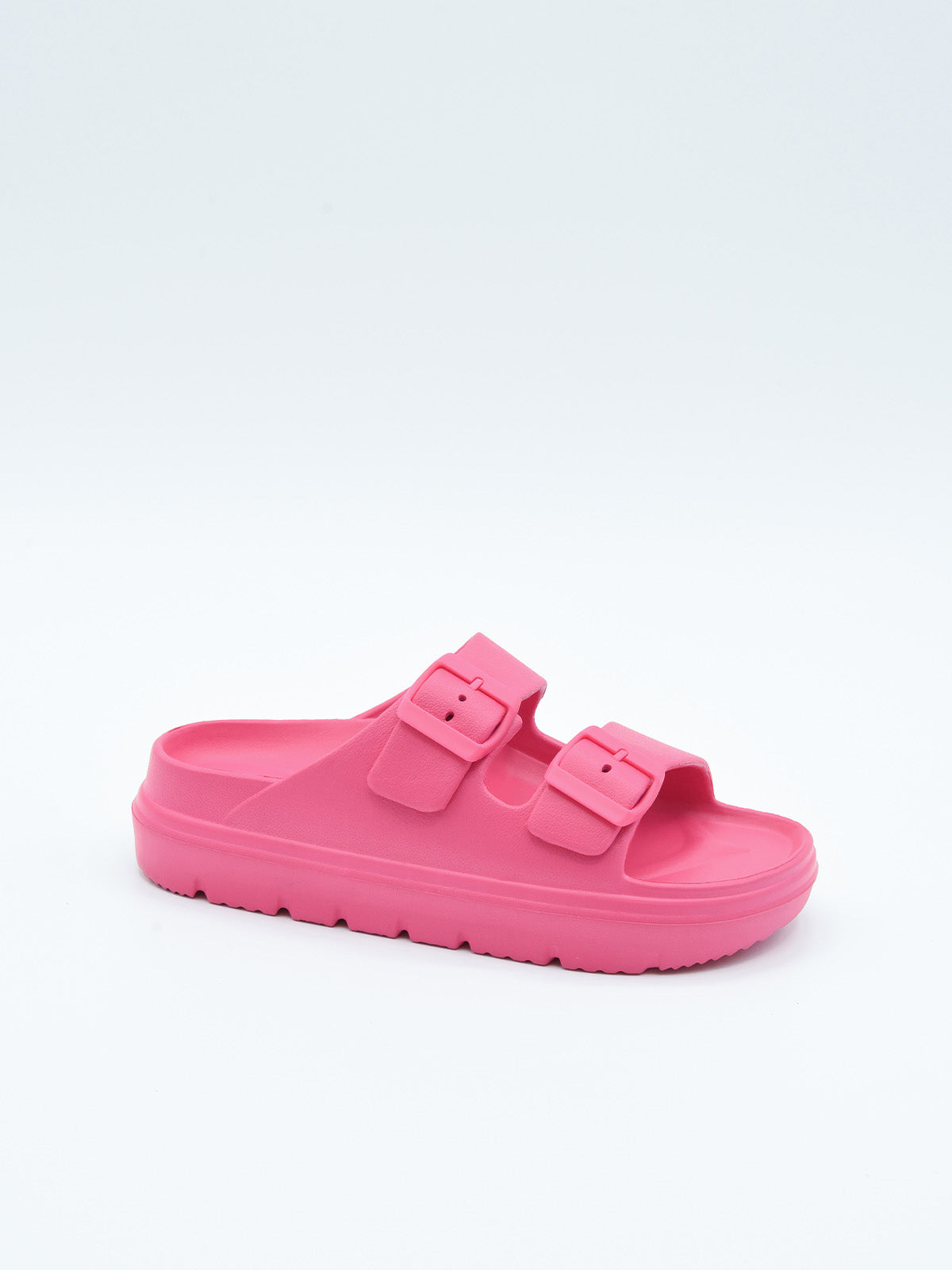 Chancla de plástico fucsia con un diseño vibrante y funcional, perfecta para acompañarte en la playa o la piscina. Su material impermeable y ligero ofrece una sensación de comodidad inmediata, mientras que la suela antideslizante garantiza seguridad al caminar sobre superficies mojadas. Las hebillas ajustables permiten un calce cómodo y firme. Con un estilo llamativo y fresco, es una opción ideal para quienes priorizan el confort con color y personalidad.